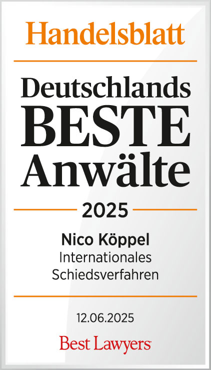 According to Handelsblatt, Nico Köppel is one of the "Best Lawyers 2023" in the areas of "Litigation”, “Arbitration / Dispute Resolution / Mediation” and “International Arbitration”.